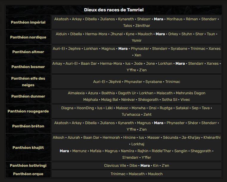 Comme dans la Théogonie grecque, les dieux ont eux-même été crées par d’autres êtres immortels à l’Aube des temps ; et comme chez les Grecs, il existe une multitude de dieux (aussi appelés et’Ada). Ceux-ci sont répartis entre les Aedra d’une part (de l’elfique « nos ancêtres ») à qui on prête un pouvoir de création et qui sont à l’origine du monde des mortel ; et les Daedra d’autre part (de l’elfique « pas nos ancêtres »), qui n’ont pas été associés à la création du monde, que l’on peut rapprocher des démons, ou des yōkai japonais, et qui ont quant à eux un pouvoir de changement, de bouleversement. Dans chacune de ces factions divines, des individus plus puissants que les autres se distinguent : les 14 Aedra majeurs d’un côté et les 17 Princes Daedra de l’autre. Chaque peuple de Tamriel (le principal continent du monde de The Elder Scrolls) a pioché dans ce vivier divin pour constituer son panthéon.